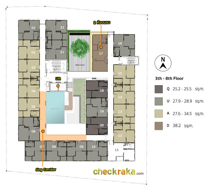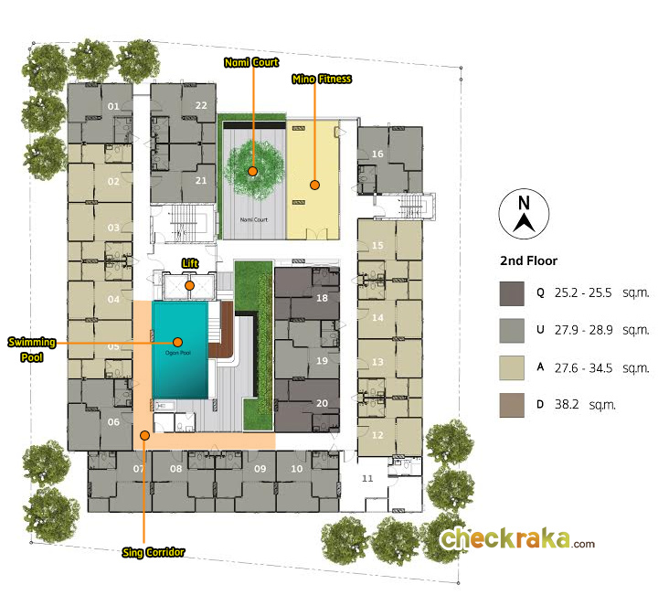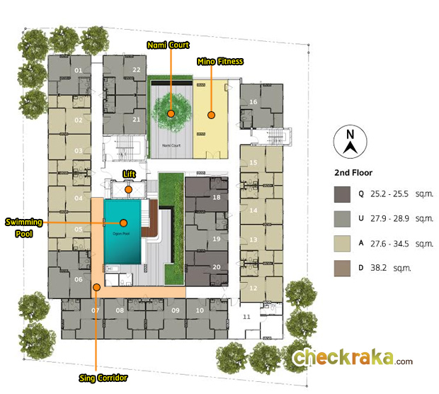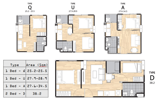 - Type Q : ห้องแบบ 1 ห้องนอน (1 ห้องน้ำ, 1 ห้องน้ำ, 1 ห้องครัวเปิด) - เนื้อที่ 25.2 - 25.5 ตร.ม.