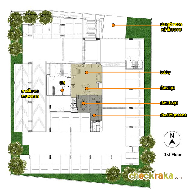 ชั้น 1 : ด้านหน้าจะเป็น Lobby ส่วนด้านหลังติด Lobby จะเป็นห้องสมุด หรือมุมอ่านหนังสือ พร้อม Wi-Fi, ห้องประชุม,
