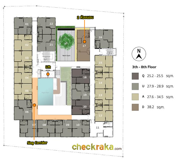 สี่เหลี่ยมบริเวณกลางอาคาร และมีห้องพักจำนวน 22 ยูนิต