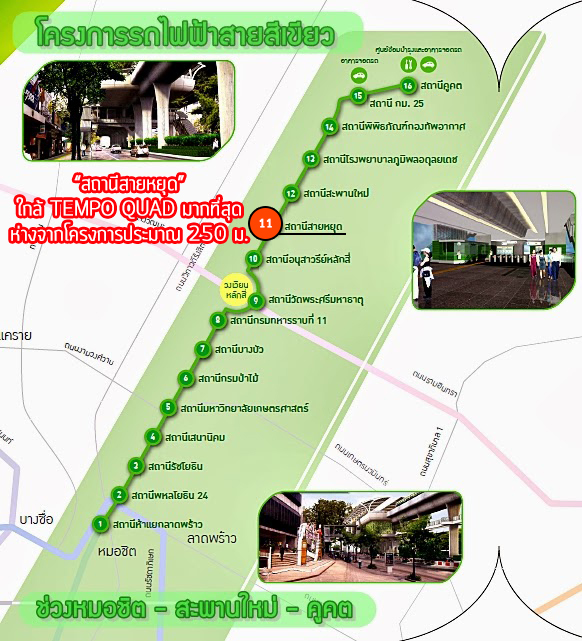 "เทมโป ควอด สะพานใหม่ (Tempo Quad Saphanmai)" เป็นโครงการที่ตั้งอยู่บน "แนวรถไฟฟ้าส่วนต่อขยายสายสีเขียว (หมอชิต-สะพานใหม่-คูคต)" ซึ่งตอนนี้กำลังอยู่ในช่วงเริ่มก่อสร้างแล้วค่ะ (ข้อมูล ณ เดือนสิงหาคม 2558) โดยคาดว่ารถไฟฟ้าจะสามารถเปิดให้บริการภายในปี 2563 สำหรับสถานีรถไฟฟ้าที่อยู่ใกล้โครงการมากที่สุด คือ "สถานีสายหยุด" ระยะทางห่างจากโครงการประมาณ 250 เมตรเท่านั้น เรียกว่าสามารถเดินเท้าได้สบายๆ เลยค่ะ