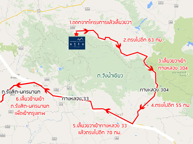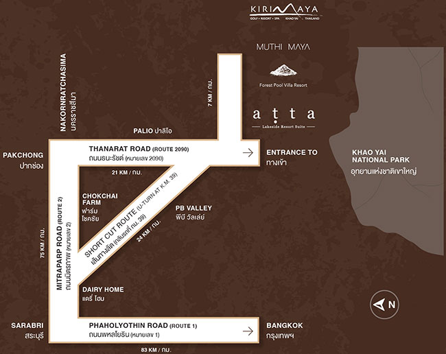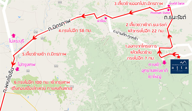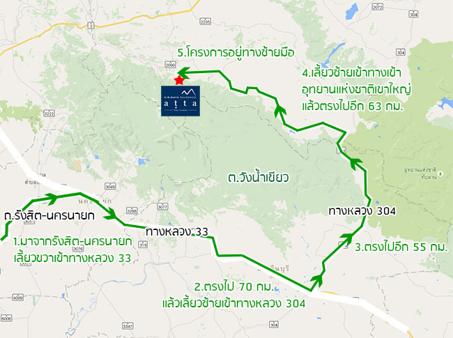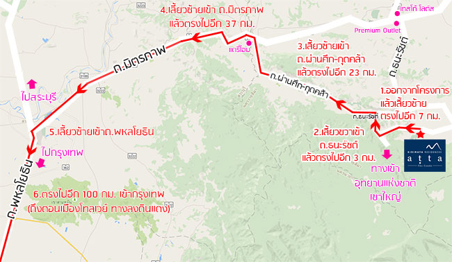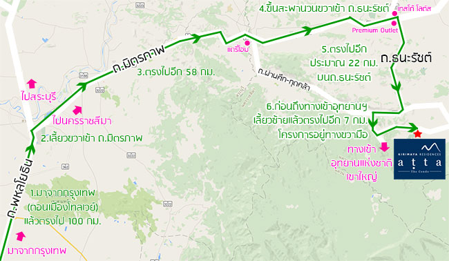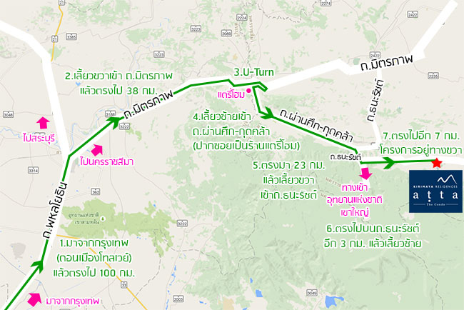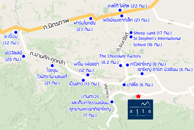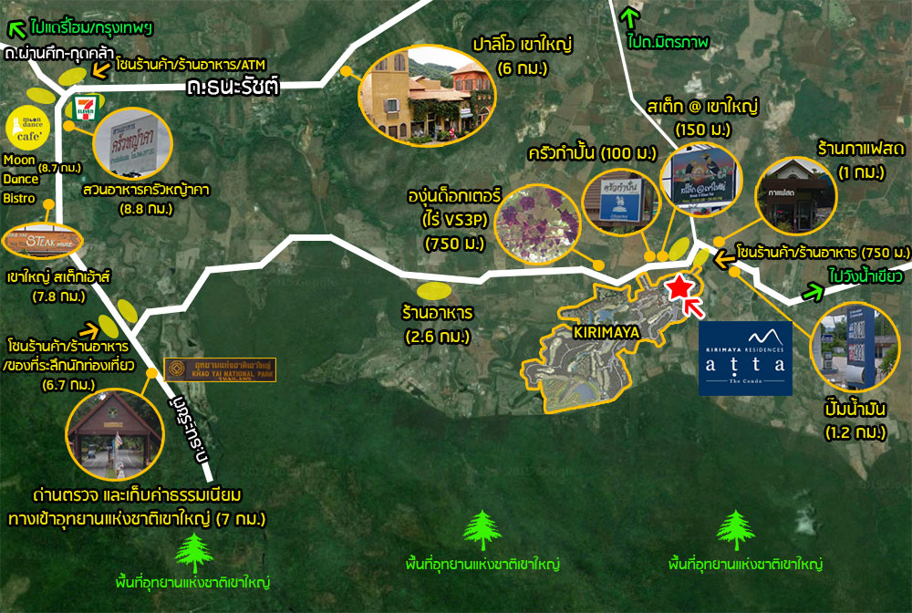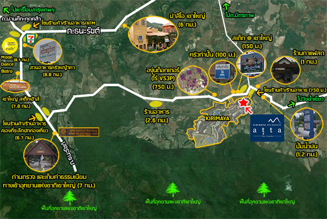 การเดินทางเข้าออกโครงการ - หากเป็นผู้ที่คุ้นเคยกับการมาเที่ยวอุทยานแห่งชาติเขาใหญ่อยู่แล้วก็ถือว่ามาไม่ยากเลยค่ะ เพียงแค่เลี้ยวซ้ายก่อนถึงด่านตรวจ และเก็บค่าธรรมเนียมอุทยานฯ ประมาณ 7 กม. ก็ถึงโครงการแล้ว หากมาจากกรุงเทพฯ ทางถนนมิตรภาพก็สามารถเข้าโครงการได้หลักๆ 2 ทาง คือ เข้า (ก) ทางถนนผ่านศึก-กุดคล้า (ด้านหน้าเป็นร้านแดรี่โฮม) ซึ่งถ้าใช้เส้นทางนี้ระยะทางจากกรุงเทพ (ถ้าวัดจากทางขึ้นทางด่วนดินแดงบนถนนวิภาวดีรังสิต) จะประมาณ 175 กิโลเมตร หรือ (ข) เข้ามาถนนธนะรัชต์ตรงใกล้ๆ พรีเมี่ยมเอาท์เล็ทเขาใหญ่ก็ได้ค่ะ (ซึ่งถ้าใช้เส้นทางนี้ระยะทางจากกรุงเทพ (ถ้าวัดจากทางขึั้นทางด่วนดินแดงบนถนนวิภาวดีรังสิต) จะประมาณ 183 กิโลเมตร นอกจากนี้ยังสามารถมาโครงการจากทางวังน้ำเขียวอีกค่ะ แต่เส้นทางนี้จะไกลกว่า 2 เส้นทางแรกค่ะ โดยรวมแล้วการเดินทางเข้าออกโครงการถือว่าสะดวกค่ะ เส้นทางตรงไปตรงมาง่ายๆ ทำเลรอบโครงการ - บรรยากาศด้านหน้าทางเข้าโครงการไม่พลุกพล่านเหมือนถนนธนะรัชต์ช่วงอื่นๆ ที่ติดกับแหล่งท่องเที่ยว ทำให้เหมาะสำหรับเป็นที่พักผ่อนค่ะ ในระยะใกล้ๆ โครงการก็มีร้านอาหาร เช่น ร้านครัวกำปั้น (ห่างจากโครงการ 100 ม.) และร้านสเต็ก@เขาใหญ่ (ห่างจากโครงการ 150 ม.) ถ้าไปตรงโซนด่านเก็บค่าธรรมเนียมอุทยานฯ ก็จะมี ร้านเขาใหญ่ สเต็กเฮ้าส์ (ห่างจากโครงการ 7.8 กม.) และร้าน Moon Dance Bistro (ห่างจากโครงการ 8.7 กม.) เลยไปหน่อยก่อนถึงถนนผ่านศึก-กุดคล้าก็มี 7-Eleven, ร้านอาหาร และ ATM ส่วนถ้าออกไปด้านนอกหน่อยก็จะมี ปาลิโอ เขาใหญ่ (ห่างจากโครงการ 6 กม.) และพรีโม เพียซซ่า (ห่างจากโครงการ 12 กม.) โดยรวมแล้วโครงการตั้งอยู่บนทำเลที่ดีค่ะ ได้บรรยากาศของความเงียบความสงบ (Seclusion) แต่ในขณะเดียวกันก็อยู่ไม่ไกลจากสถานที่ท่องเที่ยว และสิ่งอำนวยความสะดวกต่างๆ ในเขาใหญ่ ตัวโครงการโดยรวม และส่วนกลาง - โครงการนี้เป็นส่วนหนึ่งของ "Kirimaya Resort" ซึ่งเป็นรีสอร์ทที่ประกอบไปด้วยโรงแรมห้องพัก รีสอร์ทหรู ห้อง Conference และสนามกอลฟ์ 18 หลุมออกแบบโดย Jack Nicklaus ดังนั้น ประโยชน์ของเจ้าของคอนโดที่จะได้หลักๆ ของการเป็นส่วนหนึ่งในอาณาจักร Kirimaya คือ (ก) สามารถเข้าถึงส่วนกลางเหล่านี้ได้อย่างสะดวก ไม่ว่าจะเป็นสนามกอลฟ์ หรือสปา และ (ข) ค่อนข้างจะมั่นใจได้ว่าสภาพแวดล้อมโดยรวมรอบๆ โครงการรวมถึงส่วนกลาง Facility ต่างๆ จะไม่โทรม และต้นไม้ใบหญ้าน่าจะได้รับการดูแลต่อเนื่องเป็นอย่างดี สำหรับส่วนกลางที่ลูกบ้านคอนโด atta จะใช้ได้นั้น จะมี 2 ส่วนหลักๆ คือ ส่วนในคอนโดเอง ซึ่งก็มีไม่มากนักมีเพียง Clubhouse และสระว่ายน้ำเท่านั้น และที่จอด