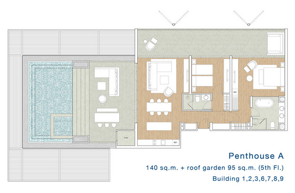 สระว่ายน้ำแบบ Infinity Edge Pool ของห้อง Penthouse ค่ะ Master Bedroom ของห้อง Penthouse ถูกจัด Layout ไว้เหมือนกับห้องแบบ 1 ห้องนอนค่ะ
