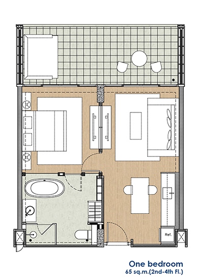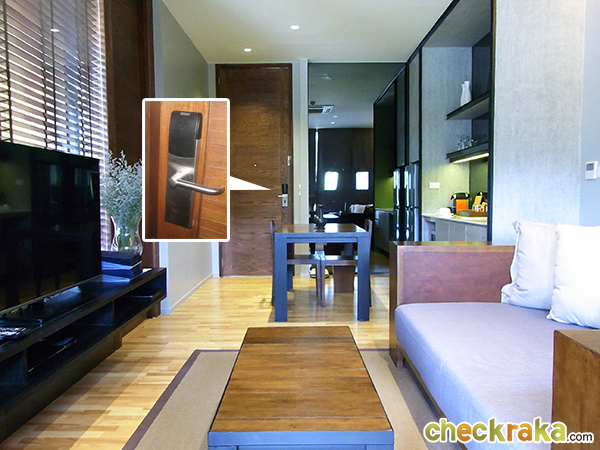 Layout ห้องแบบ 1 ห้องนอน ขนาด 65 ตร.ม. ประตูทางเข้าเมื่อเปิดเข้ามาจะเจอกับชุดโต๊ะรับประทานอาหารก่อน ถัดมาเป็นโซนรับแขก ระบล็อคประตูจะเป็นแบบ Digital Door Lock เพิ่มความสะดวก และปลอดภัยสำหรับผู้พักอาศัย จากพื้นถึงเพดานมีความสูง 2.8 เมตร และพื้นเป็นแบบ เอ็นจิเนียริ่งวู๊ด