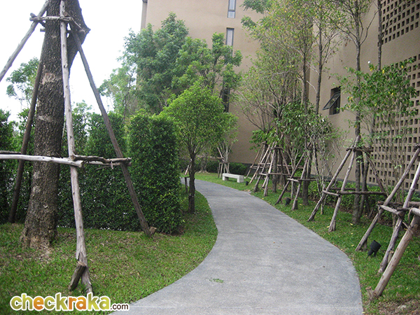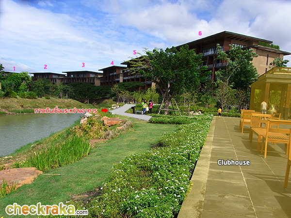 ทางเดินที่ทอดไปยังอาคารต่างๆ อาคารแต่ละอาคารจะห่างกันประมาณนี้ค่ะ เชื่อมต่อระหว่างอาคารด้วยทางเดินร่มรื่นเต็มไปด้วยต้นไม้ อาคารทุกอาคารจะได้วิวบึง และธรรมชาติเท่าๆ กัน