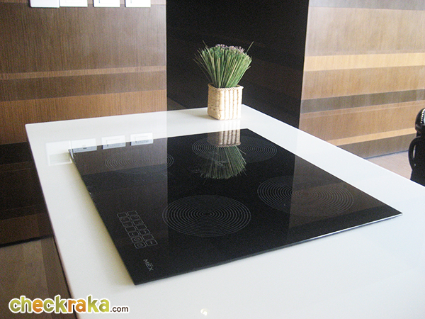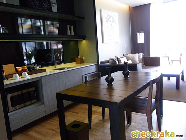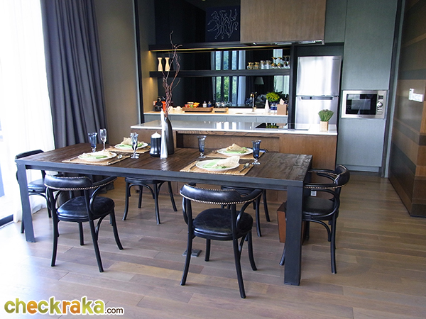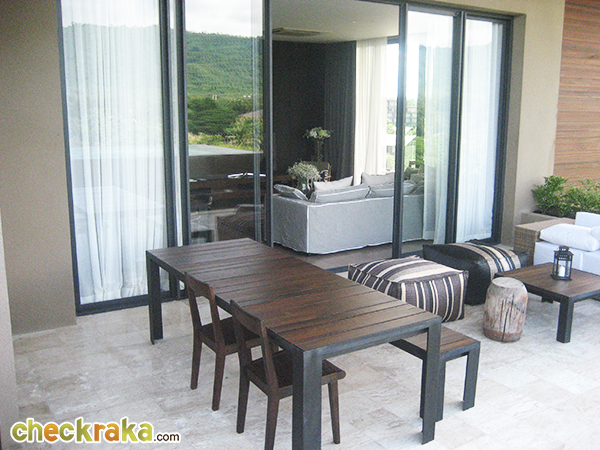 ด้านหลังโซฟาเปิดประตูกระจกออกไปเป็นระเบียงที่เรียกได้ว่ากว้างมากค่ะ เพราะมีทั้งโซนนั่งเล่น และสระว่ายน้ำแบบ Infinity Edge มุมโต๊ะรับประทานอาหารที่หันหลังให้โซฟา ทางโครงการให้ทั้งชุดโต๊ะ เก้าอี้ รวมไปจนถึงเคาน์เตอร์ครัว ทั้งหมดเลยค่ะ และเน้นเป็นเฟอร์นิเจอร์ไม้เพื่อความเป็นธรรมชาติทั้งหมด เครื่องใช้ไฟฟ้า ที่โครงการให้มาแบบ Full option สำหรับโซนห้องครัว ได้แก่ เครื่องดูดควันของ MEX เตาแม่เหล็กไฟฟ้า 4 หัว ของ MEX เช่นกัน เตาอบของ Smeq ถูก Build in ไปกับชุดครัว เดินออกมาด้านนอกในส่วนของระเบียงห้องกันบ้างค่ะ