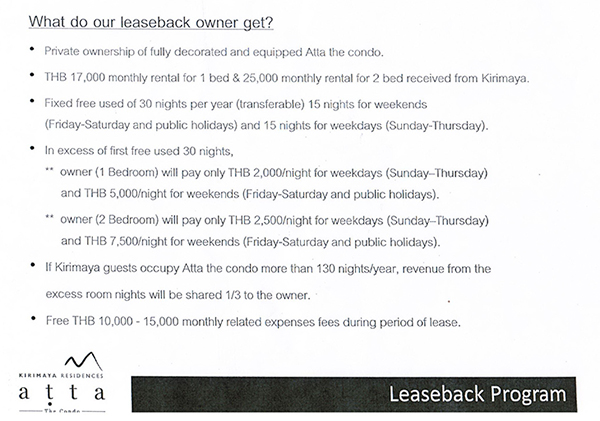 โปรแกรม Leaseback ทางบริษัท คีรีมายา จำกัดได้จัดให้มีโปรแกรม Leaseback สำหรับผู้ซื้อยูนิตในโครงการนี้ด้วยค่ะ โดยหลักการง่ายๆ ก็คือเมื่อซื้อคอนโดที่นี่แล้ว และหากสนใจจะหารายได้จากการปล่อยเช่าคอนโดที่ซื้อไว้ เพราะปกติก็ไปอยู่เพียงแค่เสาร์-อาทิตย์ หรือช่วง Long Weekend เท่านั้น ก็สามารถเข้าโปรแกรมปล่อยเช่ากลับให้เจ้าของโครงการ (Leaseback) ได้ โดยเจ้าของโครงการ (คือ บจ. คีรีมายา) จะจ่ายค่าเช่าให้เจ้าของยูนิตเป็นค่าตอบแทนต่อไป ซึ่งหากใครสนใจจะเข้าโปรแกรมนี้ ก็ลองถามรายละเอียดเพิ่มเติมจาก Sales โครงการเพิ่มเติมได้นะคะ