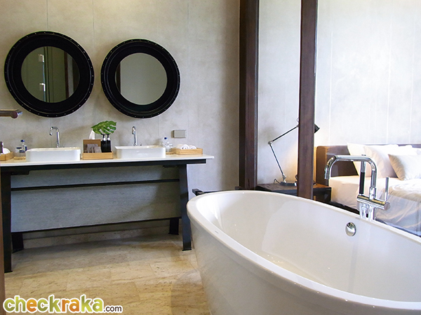 ระยะที่ค่อนข้างกว้างระหว่างโซนห้องน้ำกับห้องนอน ภายในห้องน้ำประกอบด้วยอ่างอาบน้ำ
