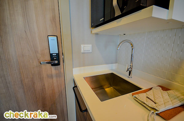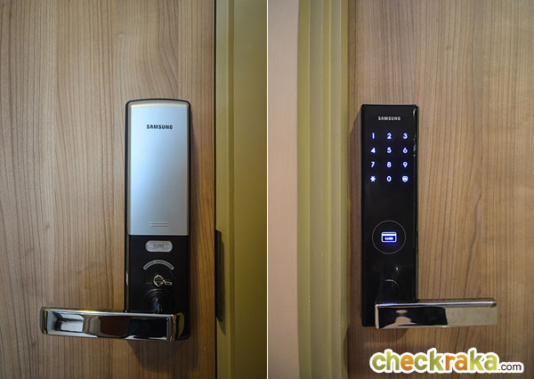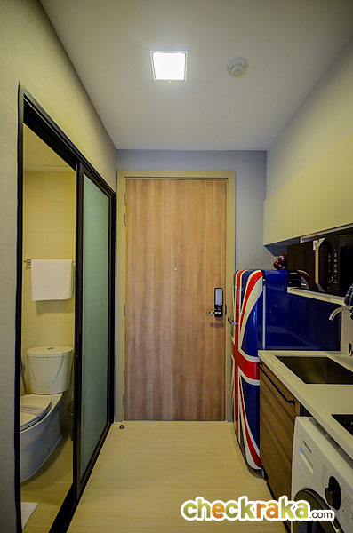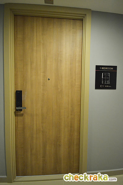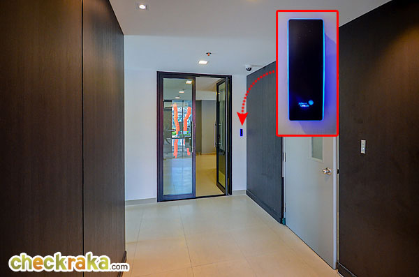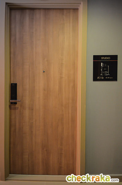 วัสดุประตูเป็นไม้หนา 36 มม. ประตูระบบ Digital Door Lock ของ Samsung ใช้ได้ทั้งระบบการ์ด และรหัสผ่าน เปิดเข้ามาจะเป็นห้องครัว มีชุดครัวของ Modernform ทั้งทางซ้าย และขวา