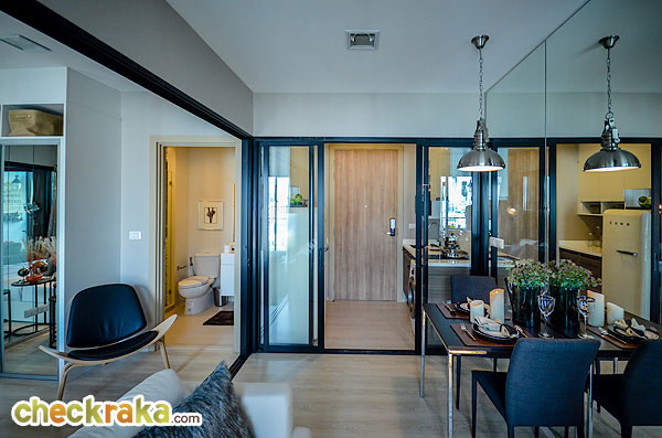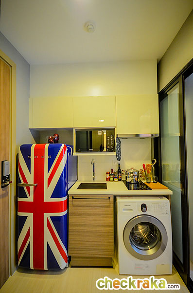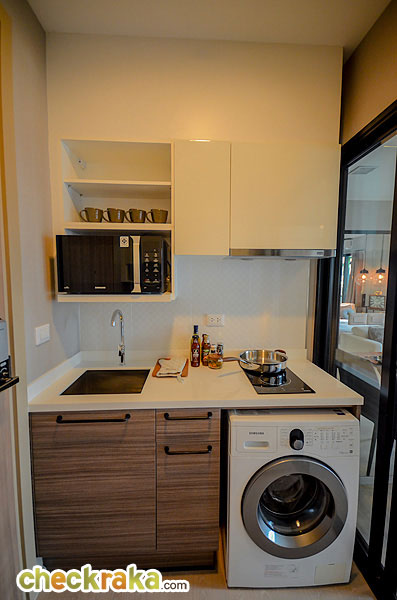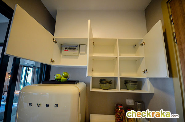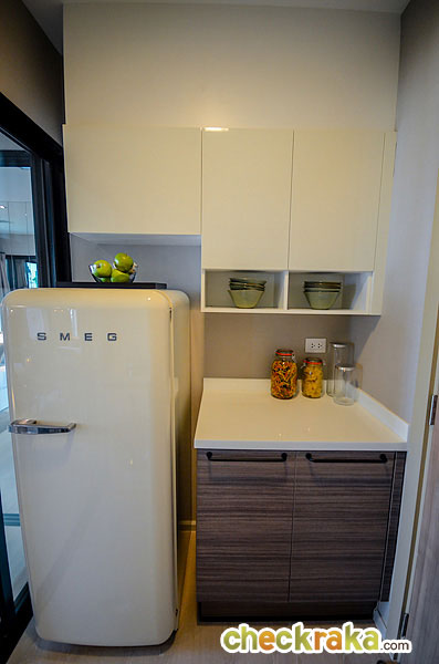 ห้องครัวเป็นครัวแบบปิดนะคะ มีประตูกระจกบานเลื่อนแบบเลื่อนเข้าหากัน กั้นเป็นสัดส่วนระหว่างห้องครัวกับห้องนั่งเล่น ข้อดีคือเวลาที่ทำอาหารแล้วกลิ่นจะไม่กระจายออกไปรบกวนโซนอื่นๆ ของห้องค่ะ