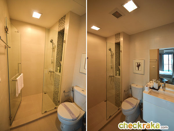 ยกธรณีสูงขึ้นประมาณ 5 ซม. ป้องกันน้ำไหลออกมาด้านนอก ในโซนอาบน้ำทางโครงการเจาะช่องที่กำแพงไว้สำหรับวางของแบบนี้ค่ะ สุขภัณฑ์ต่างๆ ภายในห้องน้ำเป็นของ American Standard แต่อ่างล่างหน้าเป็นของ Mogen