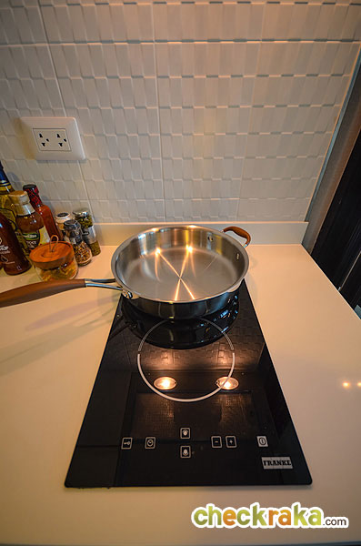 ผนังเป็นกระเบื้องสีขาวแบบนี้เลย ได้เตาไฟฟ้า 2 หัวของ FRANKE