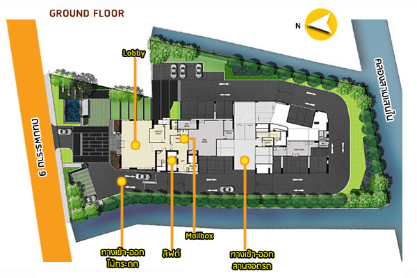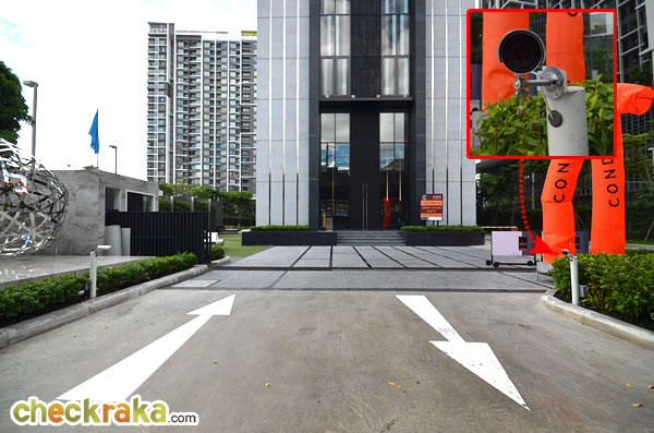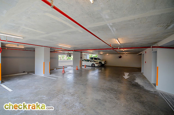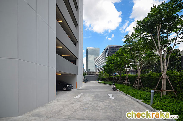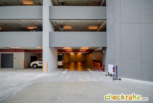 สำหรับที่จอดรถรถของลูกบ้านทางเข้า-ออกจะอยู่ทางด้านขวาของตัวอาคาร เป็นถนนกว้าง 2 เลน ขับรถสวนกันได้