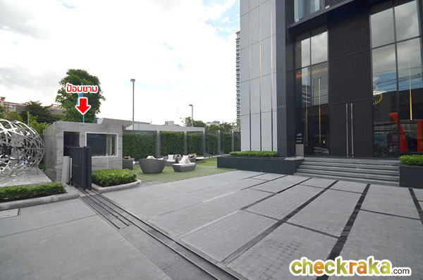 แบบ Outdoor ไว้สำหรับเป็นพื้นที่นั่งเล่นชิลล์ๆ มีทางลาดเอียงที่ออกแบบมาอำนวยความสะดวกสำหรับรถเข็นคนพิการด้วยค่ะ ประตูทางเข้าโครงการที่จะเข้าไปยังส่วนของ Lobby หรือโถงต้อนรับ