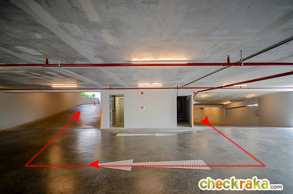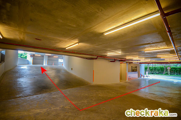 แต่หากขับเข้ามาใต้อาคารจะเป็นทางบังคับให้เลี้ยวขวาเพื่อขึ้นที่จอดรถ