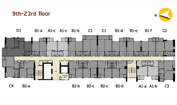 ชั้น 9 - ชั้น 23 : จะเหมือนกันคือเป็นพื้นที่พักอาศัยทั้งหมด มีจำนวนห้องพักอาศัยอยู่ที่ 20 ยูนิต/ชั้น