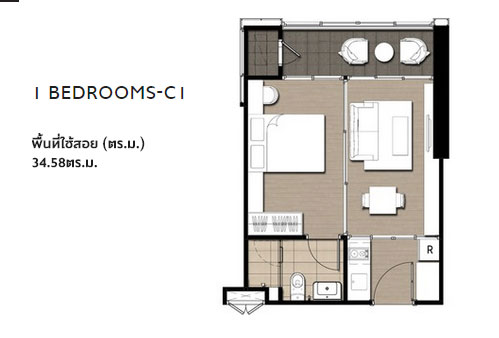 ภาพห้องตัวอย่างแบบ 1 ห้องนอน ขนาด 34.58 ตร.ม.