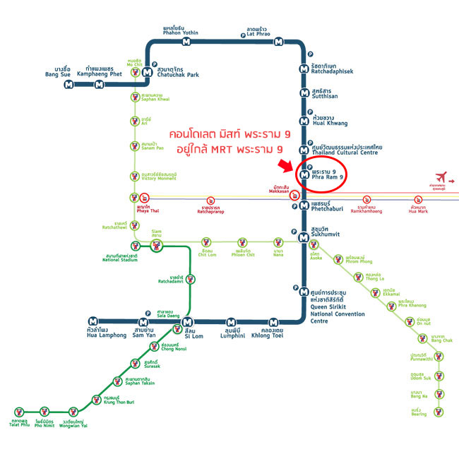 เส้นทางการเดินรถของรถไฟฟ้า MRT และจุดเชื่อมต่อรถไฟฟ้าสายอื่นๆ MRT สถานีพระราม 9 เป็นสถานีที่ใกล้กับโครงการที่สุด (ห่างจากโครงการประมาณ 250 เมตร) รูปแสดงทางเข้า-ออก ของ MRT ของสถานีพระราม 9 ค่ะ โครงการอยู่ใกล้ทางเข้า-ออกที่ 3 ที่สุด (ขอบคุณภาพประกอบจาก http://www.bangkokmetro.co.th/ ) 2.2 รถไฟฟ้า Airport Rail Link - สถานีมักกะสัน
