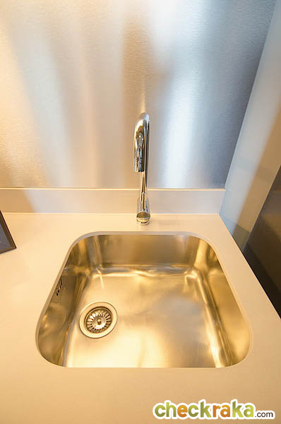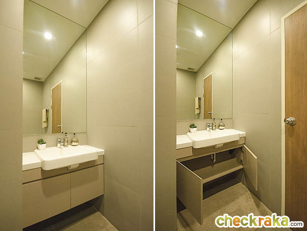 เคาน์เตอร์อ่างล้างมือเป็นของ Mogen ลิ้นชักใต้อ่างล้างมือ สำหรับติดตั้งเครื่องทำน้ำร้อน ซึ่งลูกค้าต้องซื้อมาติดตั้งเอง ภาพห้องตัวกับการตกแต่งในสไตล์ Neoretro Leisure