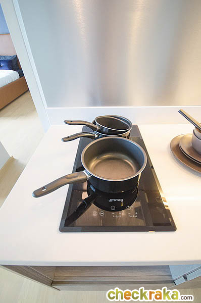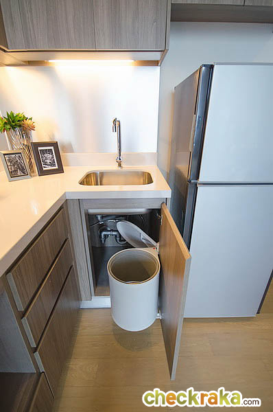 ติดกับประตูจะเป็นส่วนของห้องครัวแบบเปิด ลักษณะรูปทรงตัว L ความสูงของฝ้าอยู่ที่ 2.45 เมตร