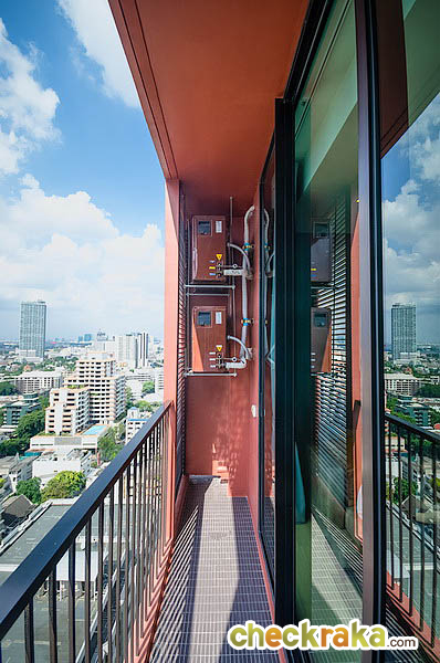 ระเบียงห้องนั่งเล่นเปิดออกมา ด้านขวามือจะเป็นตำแหน่งของคอมเพรสเซอร์แอร์ ด้านล่างทำเป็นที่วางเครื่องซักผ้า ซึ่งต่อท่อน้ำดีและน้ำทิ้งไว้ให้เรียบร้อย ส่วนราวระเบียงสูงประมาณ 1.4 เมตร ค่อนข้างสูง ความกว้างประมาณ 60 ซม.