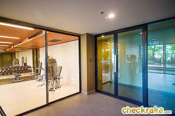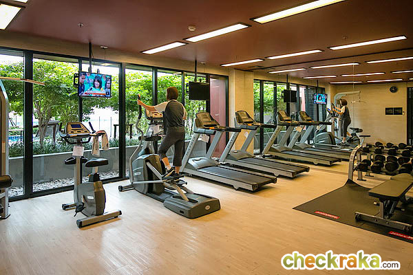 ห้องฟิตเนส พร้อมอุปกรณ์ที่ให้มาค่อนข้างเยอะ มองออกไปด้านนอกจะเป็นวิวสระว่ายน้ำค่ะ
