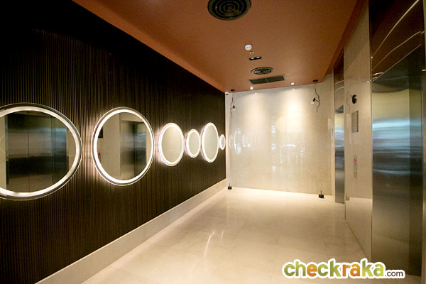 บริเวณโถงลิฟท์ ตกแต่งด้วยกระจกทรงกลมพร้อมซ่อนไฟไว้ที่ผนังด้วยเก๋ดีทีเดียว