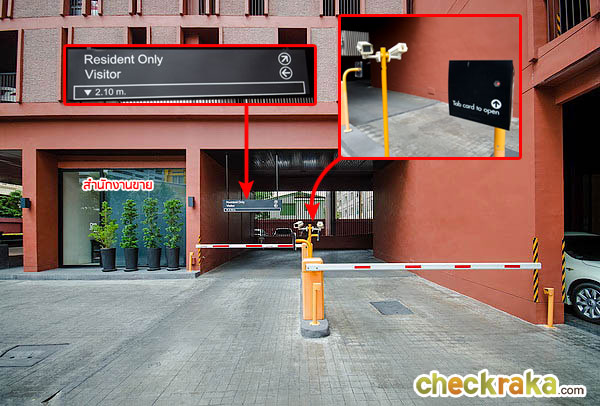 ทางขึ้นลานจอดรถสำหรับลูกบ้าน จุดนี้ต้องสแกนบัตรก่อนขึ้นจอด พร้อมทั้งมีกล้อง CCTV และ พี่ รปภ. คอยดูแลความปลอดภัยให้ด้วยค่ะ ส่วนห้องกระจกที่เห็นทางซ้ายมือเป็นสำนักงานขายค่ะ
