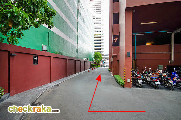 เข้าประตูมาจะเป็นทางบังคับให้เลี้ยวซ้าย เพื่อไปขึ้นลานจอดรถ มีพื้นที่สีเขียวพร้อมม้านั่ง