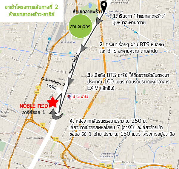 ขาเข้าโครงการเส้นทางที่ 2 (ห้าแยกลาดพร้าว-อารีย์) ขาออกโครงการเส้นทางที่ 1 (อารีย์-อนุสาวรีย์ชัยฯ) ขาออกโครงการเส้นทางที่ 2 (อารีย์-ห้าแยกลาดพร้าว) 2. การเดินทางด้วยรถไฟฟ้า