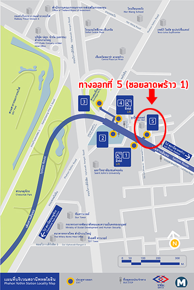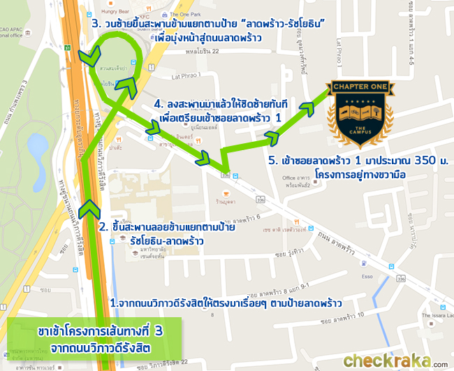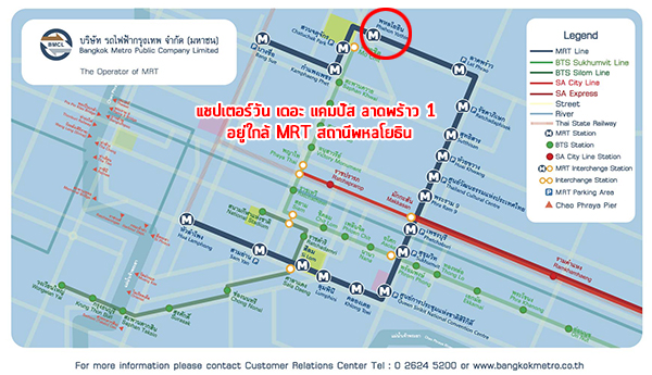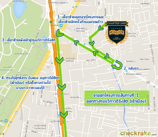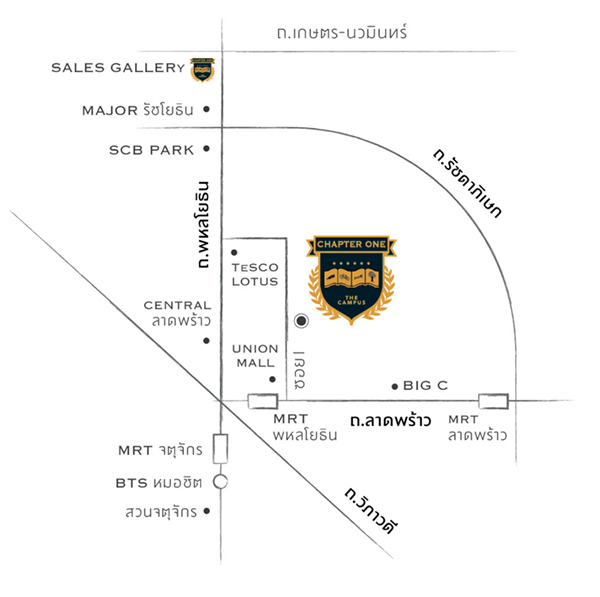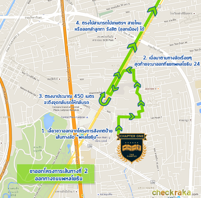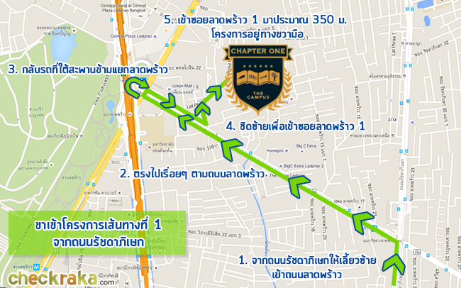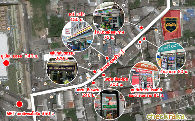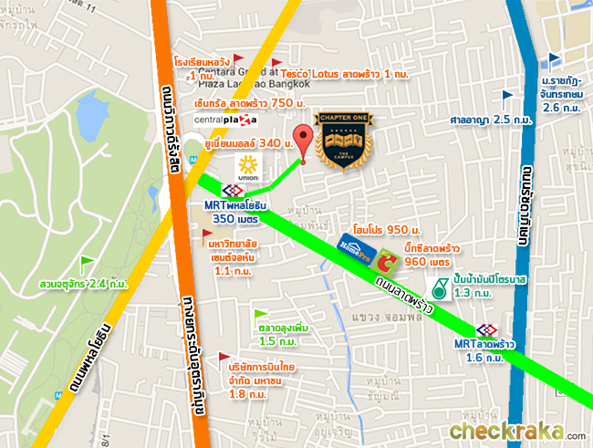 แชปเตอร์วัน เดอะแคมปัส ลาดพร้าว 1 ภาพแผนที่โครงการแจกแจงให้เห็นระยะใกล้-ไกลของโครงการกับสถานที่ หรือ Landmark รอบๆ โครงการที่น่าสนใจ ตำแหน่ง GPS โดยประมาณของโครงการ = 13.814288, 100.565065 (ระยะทางที่วัดเป็นระยะทางโดยประมาณจากการใช้รถยนต์) MRT สถานีพหลโยธิน (ทางออกที่ 5) ห่างจากโครงการประมาณ 350 เมตร