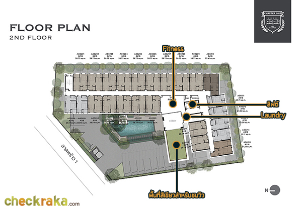 ชั้น 2 : มี Fitness ที่สามารถมองผ่านกระจกรับวิวหญ้าสีเขียวจากฝั่งตรงข้ามได้ และมีห้องที่เป็นที่ตั้งของเครื่องซัก และอบผ้าอยู่ภายในห้อง Fitness และเป็นชั้นพักอาศัย 24 ยูนิต ชั้น 3-8 : เป็นชั้นพักอาศัยชั้นละ 26 ยูนิต แต่ขนาดพื้นที่ใช้สอยของแต่ละห้องอาจจะแตกต่างกันบ้างเล็กน้อย