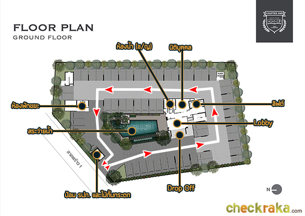 ชั้น 1 : มี Lobby เพดานสูง, สระว่ายน้ำ และพื้นที่จอดรถบริเวณใต้อาคาร สามารถจอดรถได้ 50 คัน