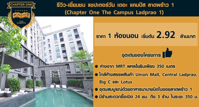 แชปเตอร์วัน เดอะ แคมปัส ลาดพร้าว 1 (Chapter One The Campus Ladprao 1) คอนโดมิเนียมแต่งครบสไตล์ Soft Loft ใกล้ MRT สถานีพหลโยธินเพียง 350 เมตร ทำเลกลางเมืองลาดพร้าวซอย 1 เพียบพร้อมด้วยสิ่งอำนวยความสะดวกมากมาย อาทิ ห้างยูเนี่ยน มอลล์ เซ็นทรัล พลาซา ลาดพร้าว Big C และ Tesco Lotus เราไปชมบรรยากาศจริงของโครงการกันเลยดีกว่าค่ะ