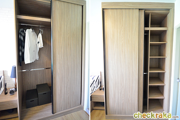 ตู้เสื้อผ้าเป็นบานเลื่อนสะดวกกับการใช้งาน ภายในตู้แบ่งพื้นที่ใช้สอยได้อย่างลงตัว