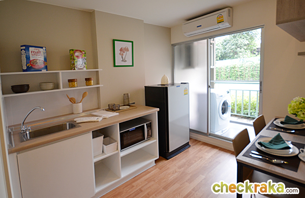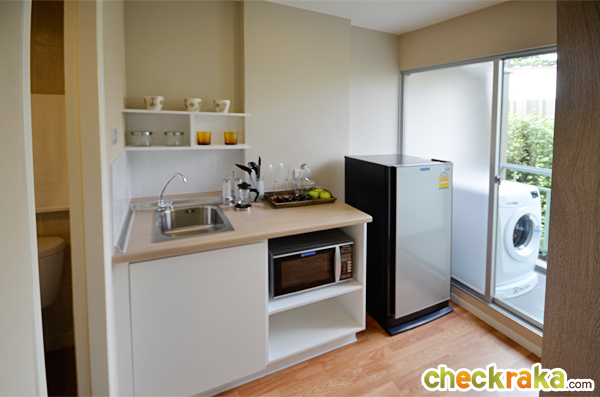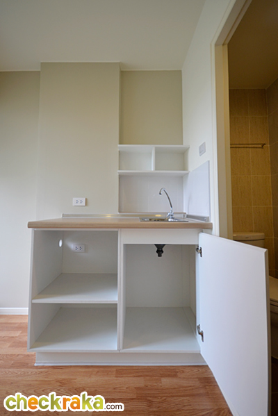 เดินเข้ามาในครัวจะมีเคาน์เตอร์ครัวอยู่ตรงกลาง ด้านซ้ายติดกับห้องน้ำ ด้านขวาติดกับระเบียง