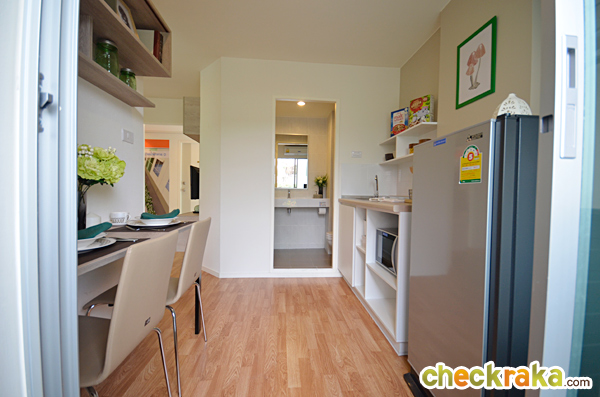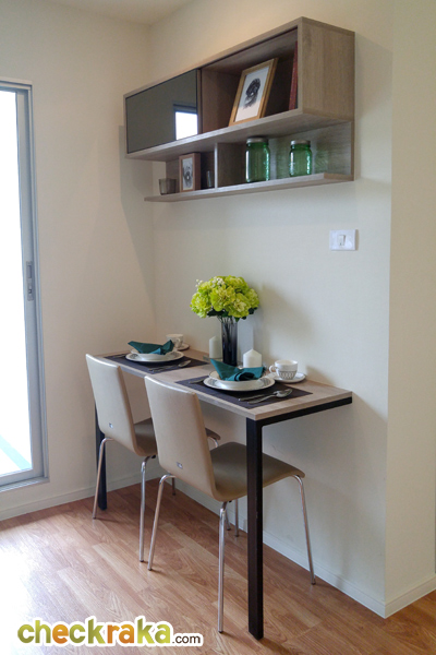 ด้านขวาของครัวติดกับระเบียงช่วยระบายกลิ่นเวลาทำอาหารได้ดี โต๊ะอาหารได้เป็นแบบ 2 ที่นั่งชิดผนังลักษณะนี้