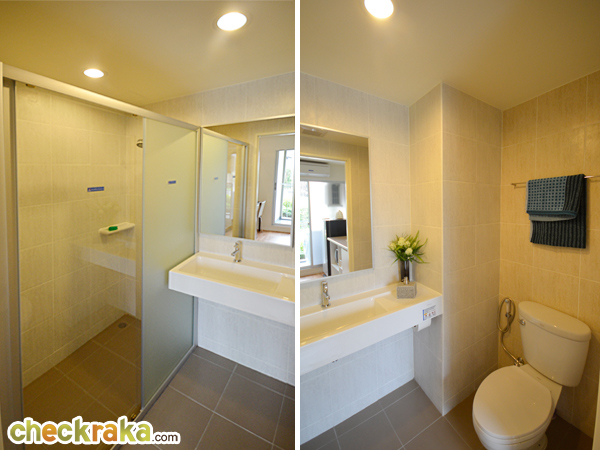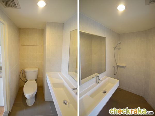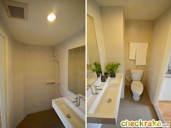 เดินเข้ามาสำรวจภายในห้องน้ำกันบ้าง ภายในห้องน้ำจะแบ่งส่วนแห้งและส่วนเปียกออกจากกัน โดยโซนเปียกเป็นพื้นลดระดับเพื่อป้องกันน้ำขัง สุขภัณฑ์ภายในห้องน้ำเป็นของ American Standard ไม่มีฉากกั้นอาบน้ำให้