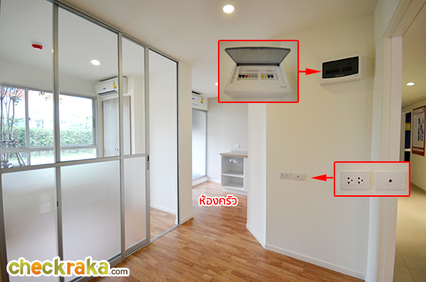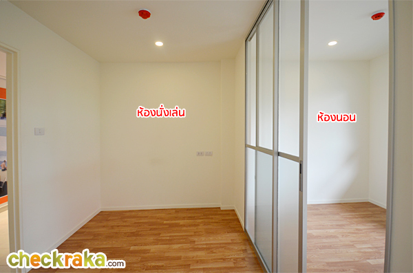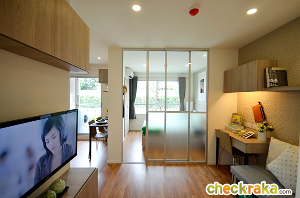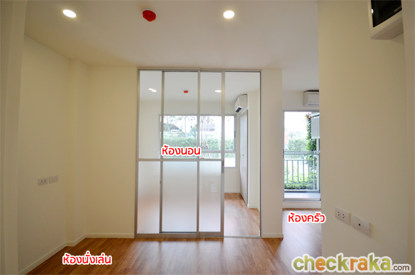 ที่กั้นด้วยกระจกบานสไลด์ แบบ 2 ตอน ด้านล่างเป็นกระจกฝ้า ด้านบนเป็นกระจกใสปกติ กรอบอลูมิเนียม ส่วนทางขวาของห้องจะเป็นห้องครัว และห้องน้ำ อีกมุมหนึ่งของห้องนั่งเล่น สำหรับวางทีวี ทางโครงการมีปลั๊กไฟ สวิตช์ไฟมาให้