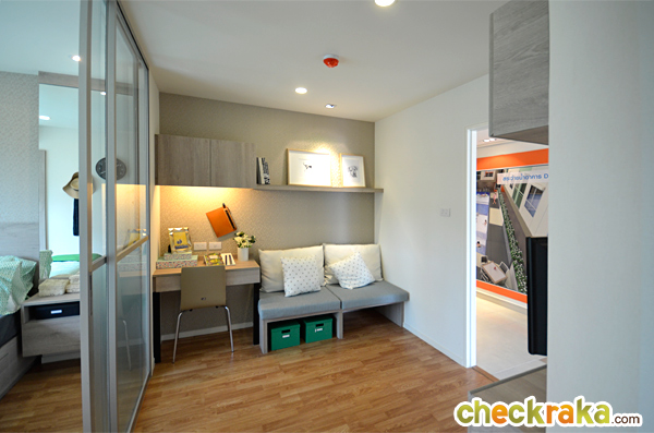 ห้องนั่งเล่นสามารถวางโซฟาขนาด 2 ที่นั่ง และด้านข้างยังวางโต๊ะทำงานได้อีก 1 ชุด