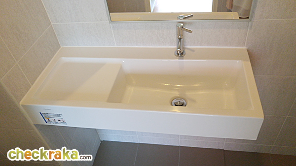 อ่างล้างหน้าเป็นของ Charmer ได้กระจกทรงสีเหลี่ยมผืนผ้าขนาดไม่ใหญ่มาก ส่วนฝักบัวเป็นของ Hafele พร้อมที่วางสบู่ ในห้องน้ำติดตั้งพัดลมดูดอากาศมาให้ด้วย 2) ห้องแบบ 1 ห้องนอน ขนาด 26.00 ตร.ม.