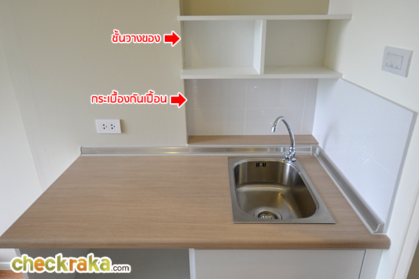 ที่ผนังได้กระเบื้องสำหรับกันเปื้อนมาให้บางส่วน พร้อมชั้นวางของ