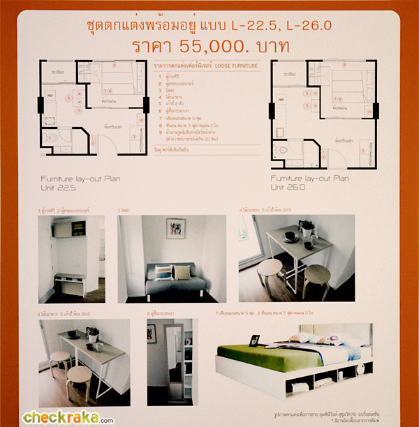 แพ็คเกจชุดแต่งห้องพร้อมอยู่ขนาด 22.50 ตร.ม. ราคาค่าตกแต่งอยู่ที่ประมาณ 55,000 บาท