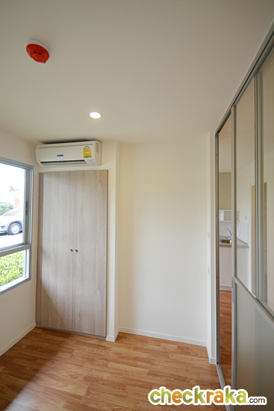 ส่วนกระจกในห้องนอนด้านบนเป็นแบบบานสไลด์ ด้านล่างเป็นบานติดตาย ภายในห้องนอนจะได้ตู้เสื้อผ้า Built-in