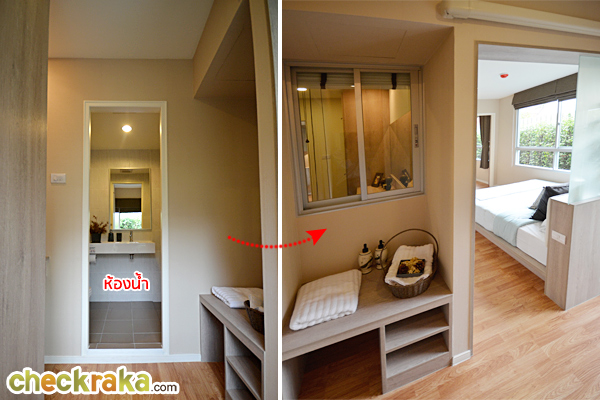 ฝั่งตรงข้ามกับโต๊ะเครื่องแป้งเป็นชั้นสำหรับวางของ มีหน้าต่างแบบบานเลื่อนมองเห็นห้องนอนเล็กได้