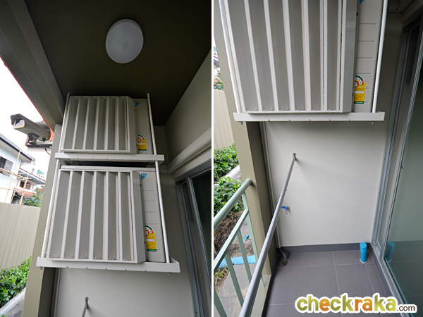 ด้านนอกเป็นระเบียงซักล้าง สำหรับตั้งเครื่องซักผ้า ต่อท่อน้ำดีน้ำทิ้ง และก๊อกเตี้ยมาให้