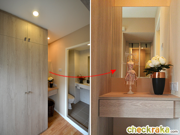 ถัดมาเป็นโต๊ะเครื่องแป้งขนาดกะทัดรัด โทนสีเดียวกันกับตู้เสื้อผ้า