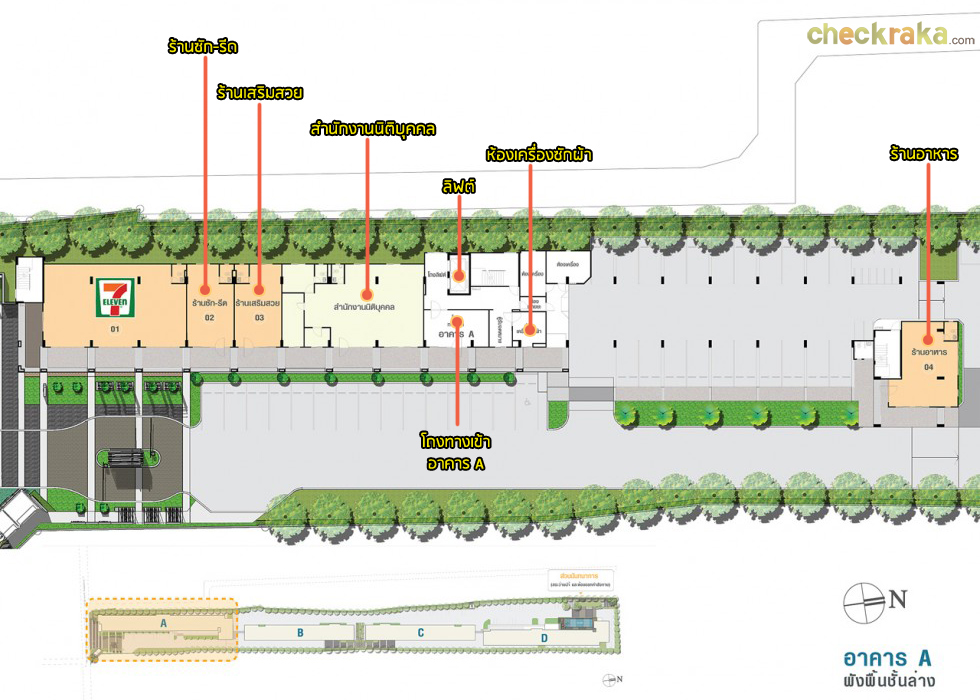 โมเดลอาคาร A มุมมองจากทิศตะวันออก จากประตูทางเข้า ขับตรงเข้ามาจะเป็นพื้นที่สำหรับจอดรถ โดยอาคาร A จะมีส่วนที่เป็นร้านอาหารอยู่ด้วย