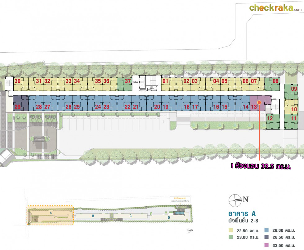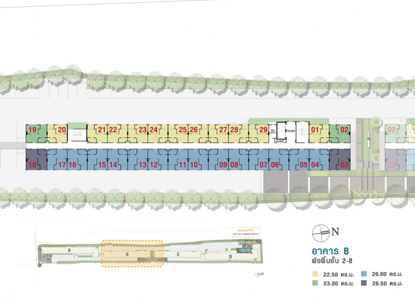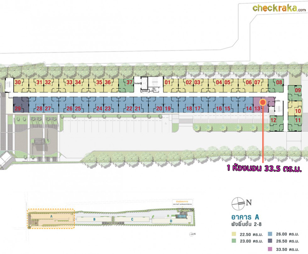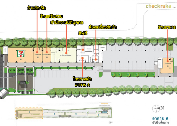 Master Plan อาคาร A ชั้นล่าง จะเป็นพื้นที่จอดรถ และร้านค้า 4 ร้าน (7-Eleven ร้านซักรีด ร้านเสริมสวย และร้านอาหาร), ลิฟต์โดยสาร 2 ตัว ชั้น 2-8 จะเหมือนกันคือเป็นส่วนพักอาศัยมียูนิตต่อชั้นอยู่ที่ 37 ยูนิต โดยจะมีห้องใหญ่ขนาด 33.50 ตร.ม. อยู่ชั้นละ 1 ยูนิต Master Plan อาคาร B ชั้นล่าง จะมีห้องสมุดมีชีวิต, พื้นที่จอดรถ, ลิฟต์โดยสาร 2 ตัว ชั้น 2-8 เป็นส่วนพักอาศัยมียูนิตต่อชั้นอยู่ที่ 29 ยูนิต Master Plan อาคาร C ชั้นล่าง จะมีห้องกิจกรรมผู้สูงอายุ, ห้องกิจกรรมสำหรับเด็ก, พื้นที่จอดรถ และมีสนามเด็กเล่นตั้งอยู่ด้านนอกอาคาร พื้นที่ระหว่างอาคาร B กับอาคาร C ชั้น 2-8 เป็นส่วนพักอาศัยมียูนิตต่อชั้นอยู่ที่ 29 ยูนิต Master Plan อาคาร D ชั้นล่าง จะมีตู้จดหมาย, ที่จอดรถ, ห้องเครื่องซักผ้า, สวนพักผ่อน, โซนออกเครื่องออกกำลังกายกลางแจ้ง, ลิฟต์โดยสาร 2 ตัว ชั้น 2 จะมีสระว่ายน้ำ, ห้องฟิตเนส และส่วนพักอาศัย ชั้น 3-8 เป็นส่วนพักอาศัยมียูนิตต่อชั้นอยู่ที่ 34 ยูนิต ส่วนกลางและสิ่งอำนวยความสะดวก