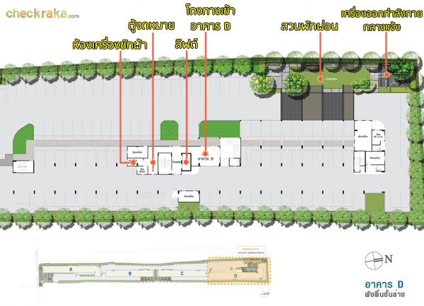โมเดลอาคาร D มุมมองจากทิศตะวันตก ชั้น 1 ทางโครงการจัดเป็นโซนสำหรับออกกำลังกายกลางแจ้ง พร้อมสวนพักผ่อน