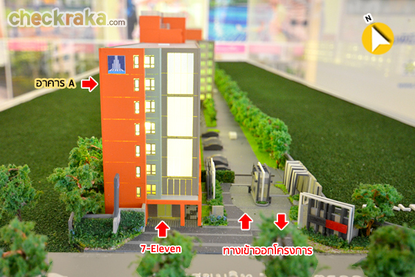 โมเดลอาคาร A มุมมองจากทิศใต้ ติดถนนซอยสุขุมวิท 76 โดยใต้อาคาร A จะมี 7-Eleven อยู่ด้วย